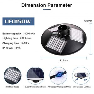 Đèn năng lượng mặt trời UFO 150W chính hãng JD Jindian sử dụng 3 tấm led 80 chíp SMD nâng tổng số lượng chíp lên đến 240 chíp đạt độ chiếu sáng cực tốt bán kính 100m2 trong khu vực sân vườn nhà bạn và chiếu sáng đường rất phù hợp. Vì được thiết kế với cảm biến hình tròn và góc chiếu hình UFO nên đèn có thể tạo ra ánh sáng đều xoay quang khu vực lắp đặt mà không bị hạn chế góc chiếu sáng.